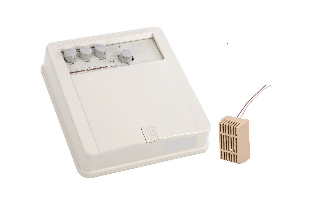 mit Drehknöpfen zur stufenlosen Temperaturwahl 30-120 °C, Ein-/Ausschaltung der Heizung, Ventilator und Licht sowie Touch-Feldern für 12-Std.-Vorwahluhr. Durch eine vom Elektriker steckbare Brücke mit oder ohne Betriebszeitbegrenzung 6 oder 12 Stunden verwendbar. Mit Kontrollleuchten für Betrieb, Heizphase und Vorwahluhr. Inkl. Temperaturfühler/Überhitzungs-schutz im Kunststoffgehäuse mit ca. 3 m langer roter und weißer Zwillingslitze 2x0,5 mm², 400 V/50 Hz, IP44-wassergeschützt. Made in Germany. Für Saunaofen über 9 kW Heizleistung ist zusätzlich ein Leistungsschaltgerät siehe Art.-Nr. 8178 notwendig. Ein Steuergerät für Saunaofen mit Verdampfer ist auf Anfrage lieferbar, Maße: BxHxT ca. 215x230x70 mm