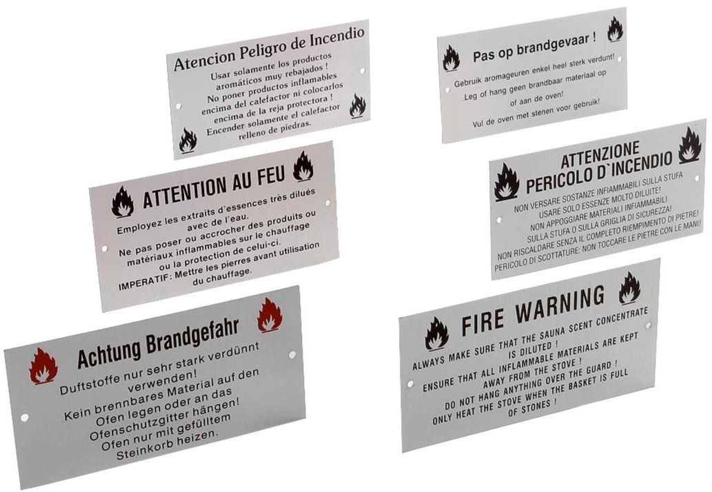 Montage über dem Saunaofen an der Saunainnenwand, entspricht der VDE-Vorschrift für Saunen. Deutsch 2-farbig - andere Sprachen 1-farbig bedruckt,
