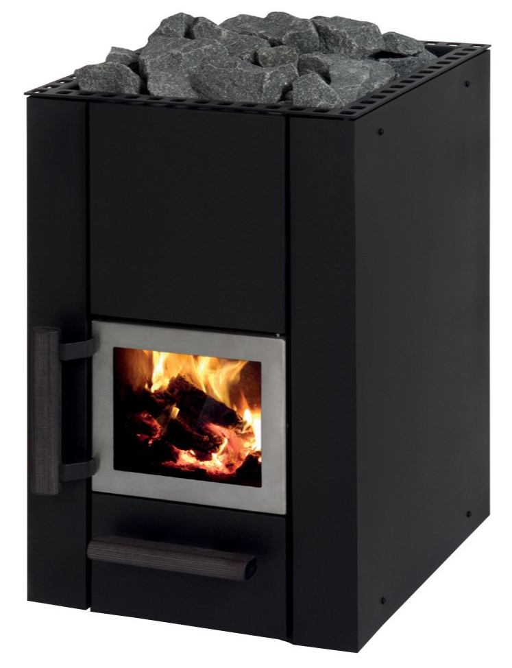 z. B. mit konstant auf zwischen 150-220 °C beheizten ca. 80 kg Aufgusssteinen zum Aufheizen der Kabine auf Saunatemperatur