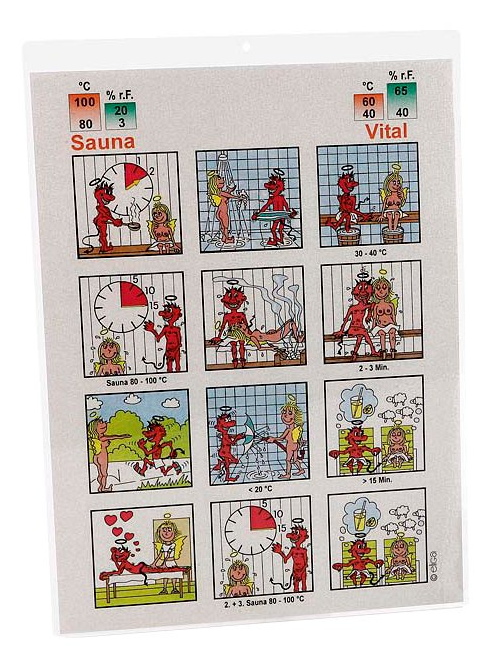 in Bildsprache (Urheberrechtsschutz) auf 5 mm starkem, glasklarem Acrylglas mit polierten Kanten gedruckt, Firmeneindruck ist möglich, inkl. 2 Wandabstands haltern. Hochwertige Ausführung für die exklusive private oder gewerbliche Sauna - passend zur Ausführung für Dampfbad Art.-Nr. 82908