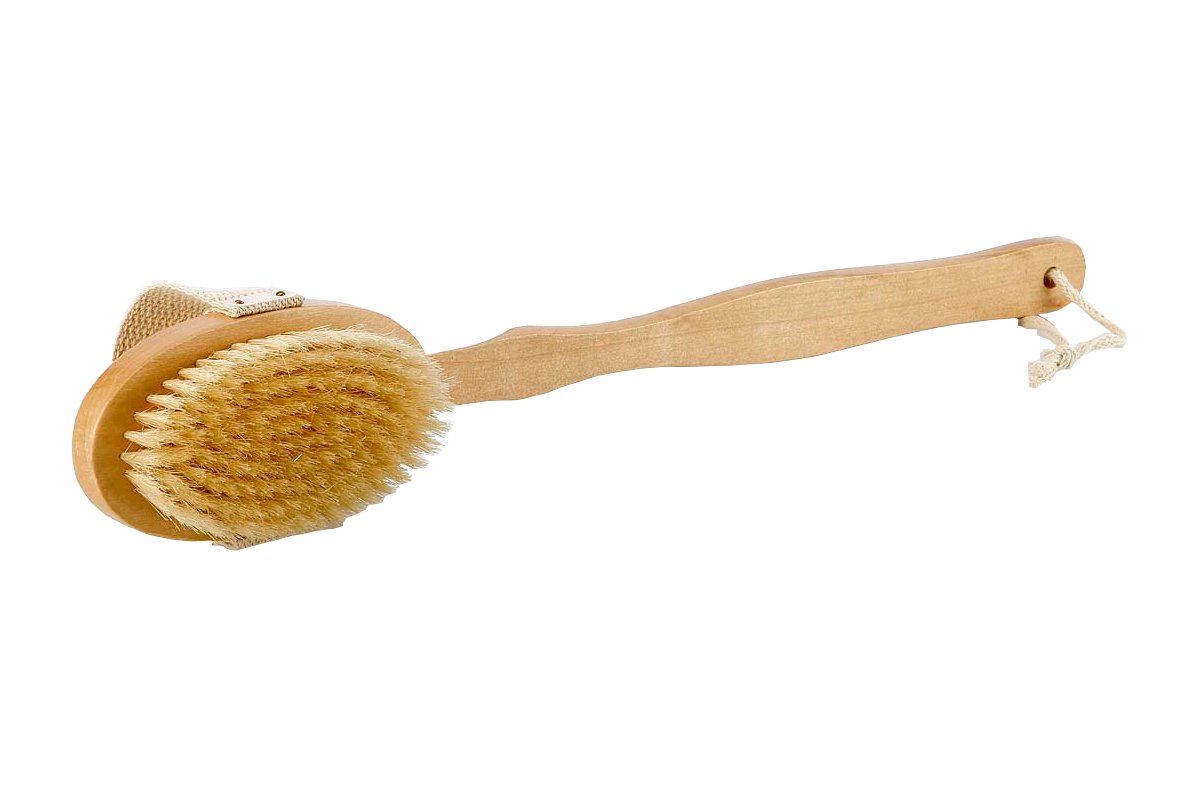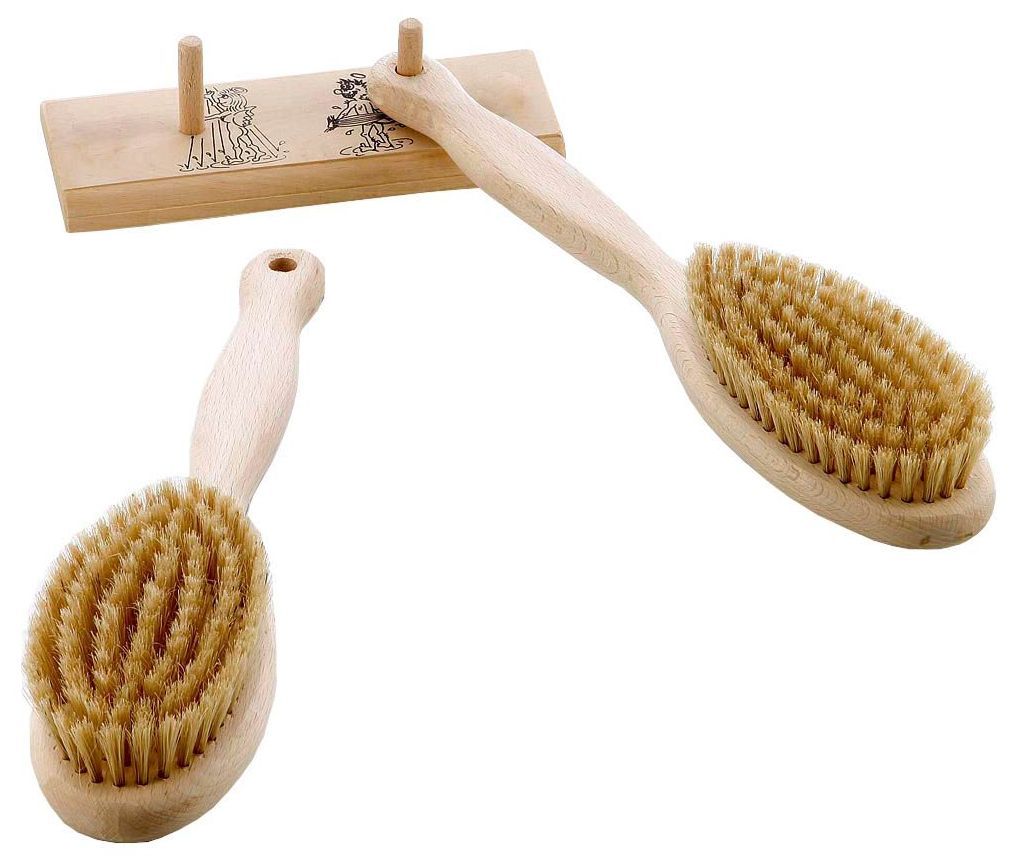 aus Holz natur mit ca. 2 cm hohen Naturborsten, europäische Fertigung. Eine Hautmassage fördert die Durchblutung