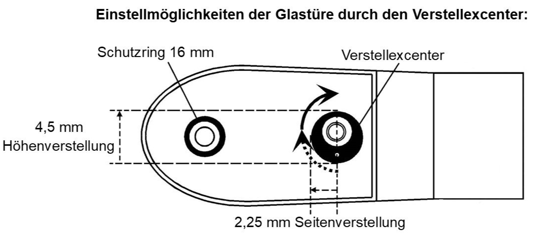 - Höhen-/Seitenverstellung der Glastüre bis 4,5 mm ist je nach Einbaulage des Verstellexcenters möglich (siehe Abbildung)