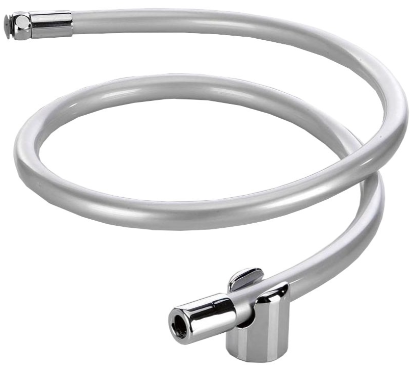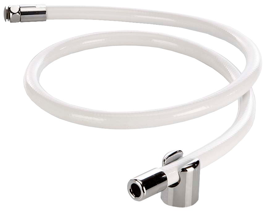 lebensmittelechter, doppelwandiger Schlauch für einen weichen und vollen Wasserstrahl, mit glanz-verchromter Überwurfmutter und Auslaufendstück aus Metall zum Einhängen in den mitgelieferten Wandhalter