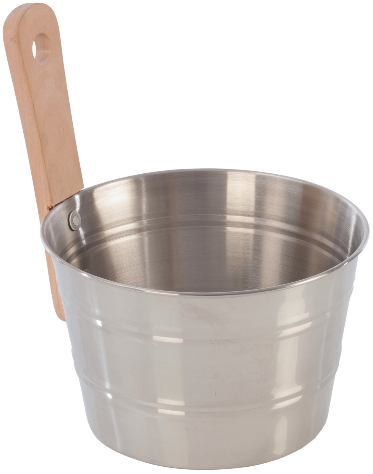 Mulde Ø 25 cm aus Edelstahl - Muldeninhalt ca. 3,5 l, hochglänzend poliert, fugenlos verschweißt, mit ca. 3 cm dickem Birkenholzstiel. Für die gewerbliche Aufgusszeremonie oder zur Schaufensterdekoration, passend zu Aufgusseimern Art.-Nr. 83799 und Art.-Nr. 8380