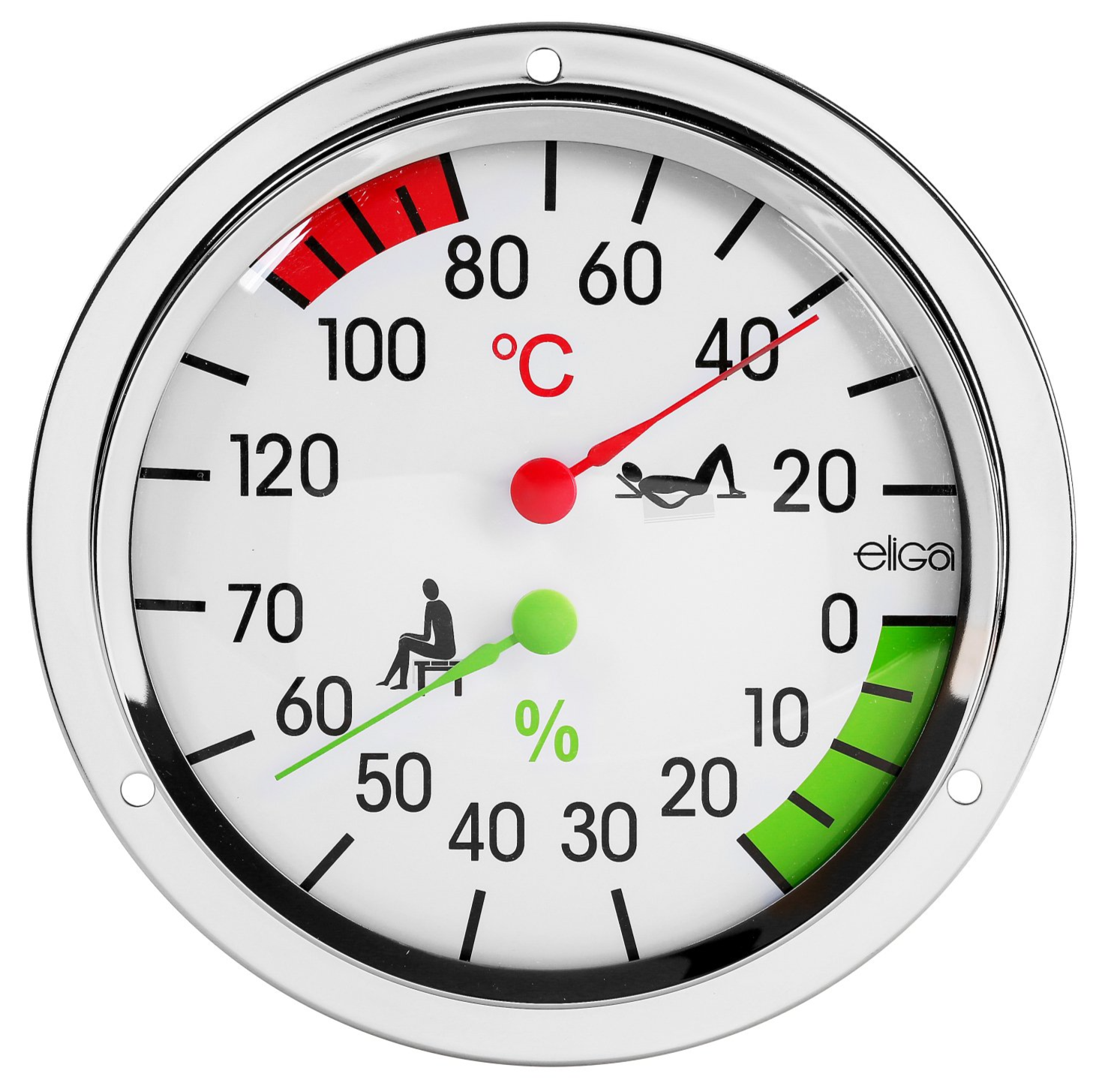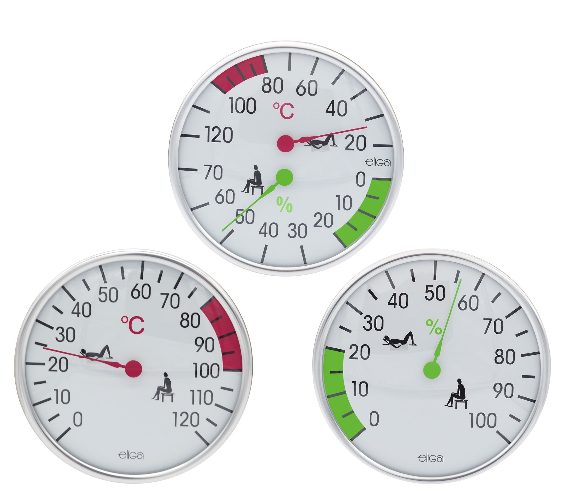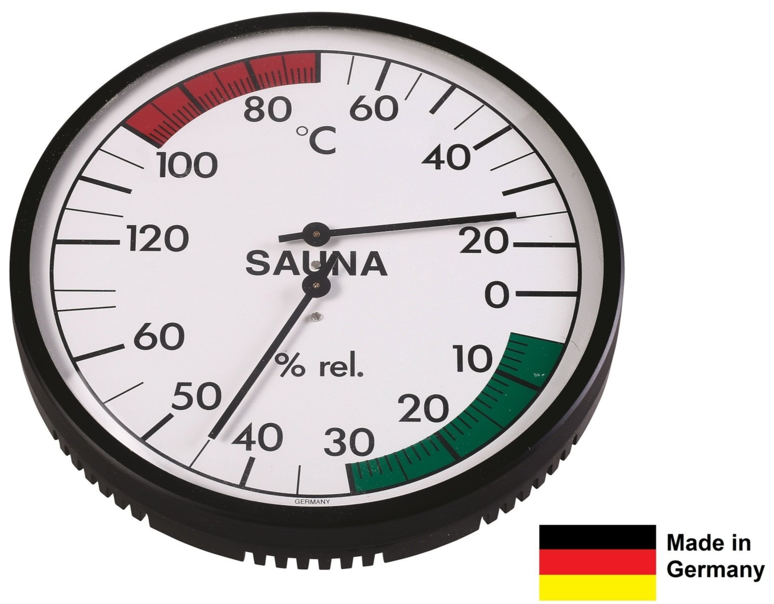 Messgeräte 135 mm Präzisionsinstrumente (Hygrometerwerk mit Faden, Thermometerwerk Bimetall) mit nachstellbarem Messwerk, Abdeckring verchromt, Skala silber - Saunamessbereiche farbig markiert, Gehäuse aus schwarzem Kunststoff