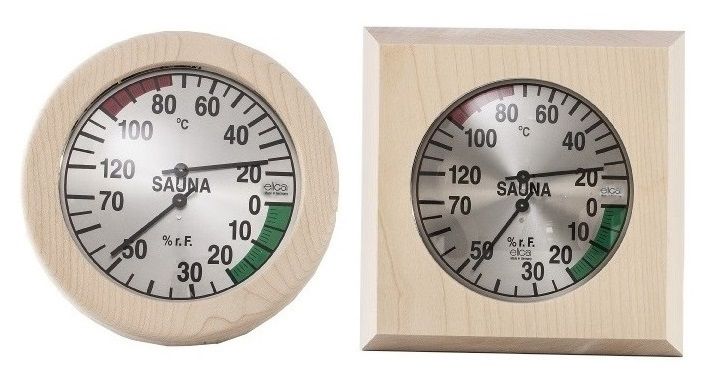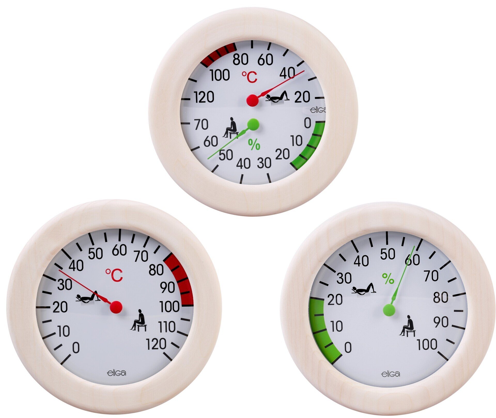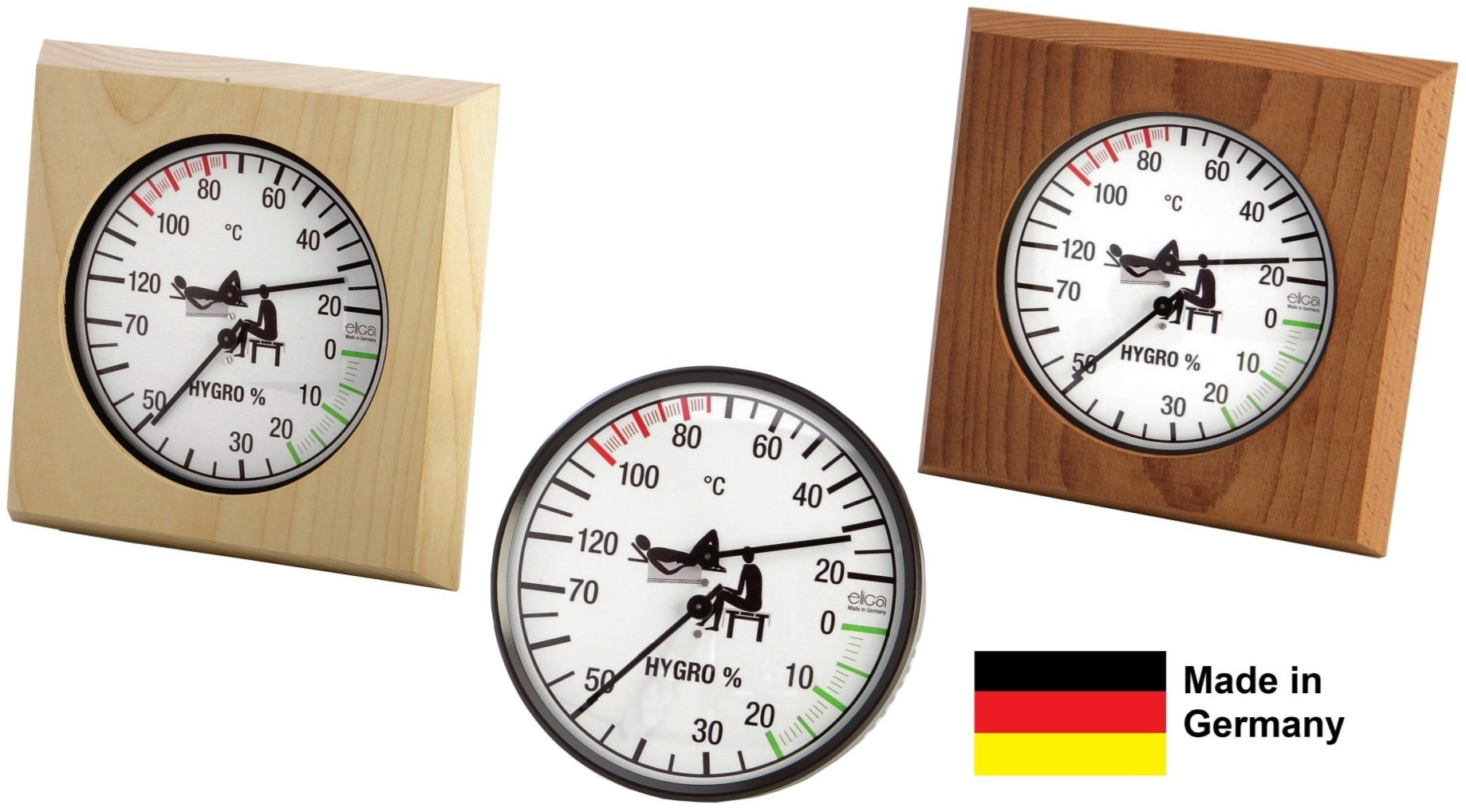 Messgeräte 135 mm Präzisionsinstrumente (Hygrometerwerk mit Faden, Thermometerwerk Bimetall) mit nachstellbarem Messwerk, Abdeckring verchromt, Skala silber - Saunamessbereiche farbig markiert, Gehäuse aus schwarzem Kunststoff
