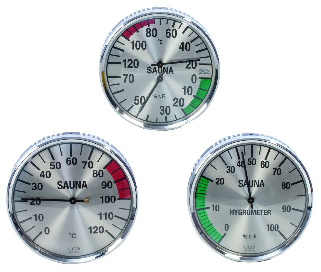 Messgeräte 128 mm Bimetall-Messgeräte mit nachstellbarem Messwerk, Gehäuse aus schwarzem Kunststoff mit Abdeckring aus Aluminium, Skala weiß - Saunamessbereiche sind farbig markiert