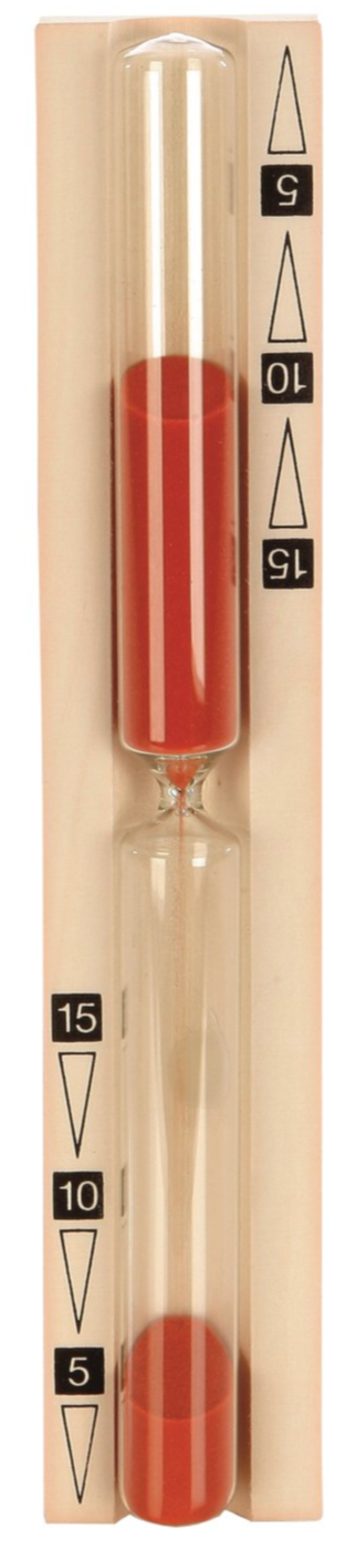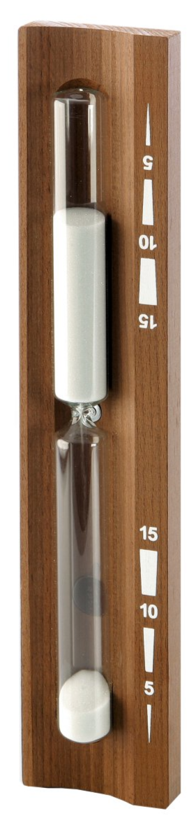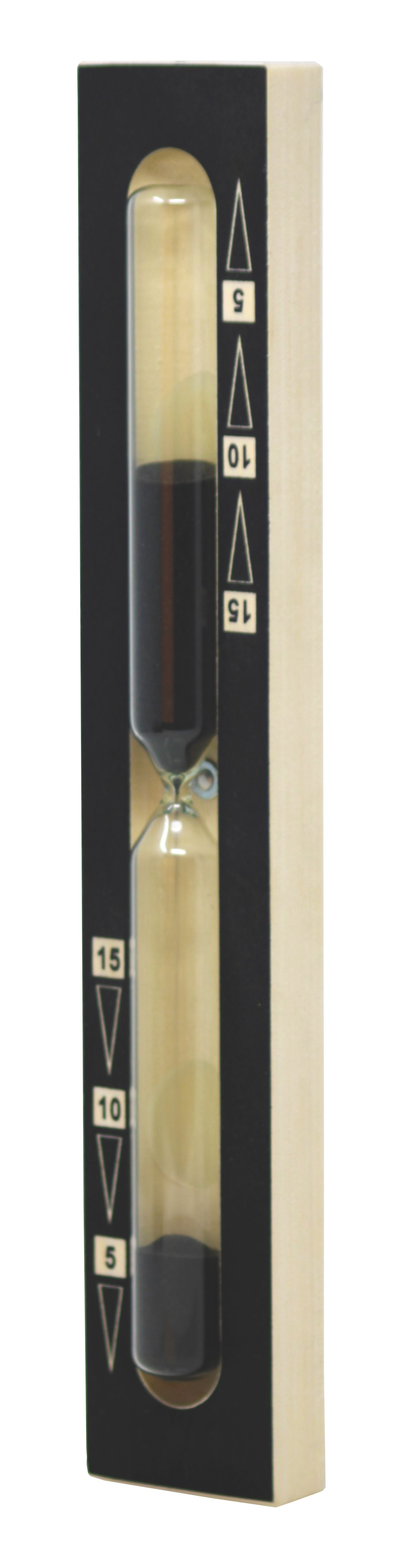 Drehgestell aus Holz mit schwarz bedruckter Frontseite und unbedruckter Minutenskala, Glaszylinder mit schwarzem Sand befüllt , Laufzeit 15 Min. - Laufzeit-Toleranz +/- 2 Minuten