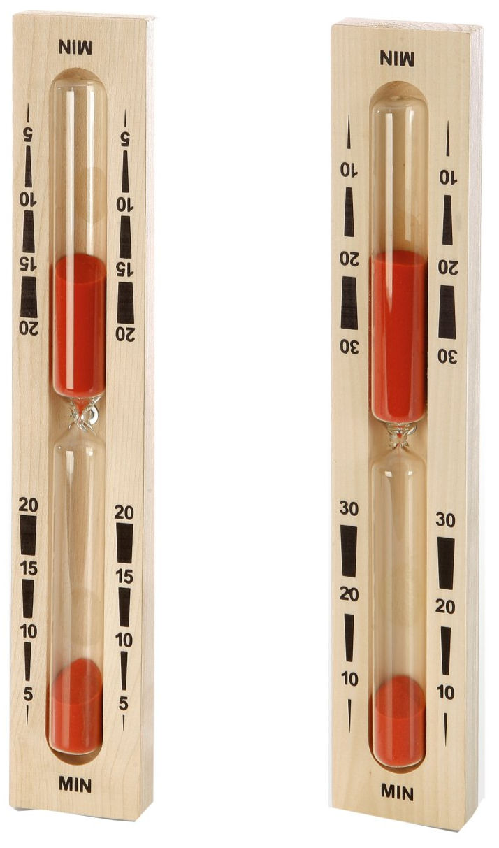 Drehgestelle aus Holz mit bedruckter Minutenskala, Glaszylinder mit Sand befüllt - Laufzeit-Toleranz +/-2 Minuten