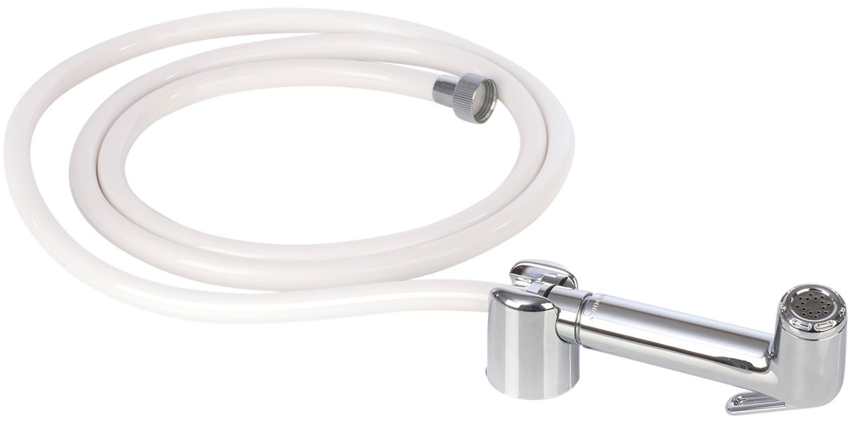 Druckbrause glanz-verchromt mit weißem PVC-Schlauch Länge ca. 2 m und Überwurfmutter 1/2”