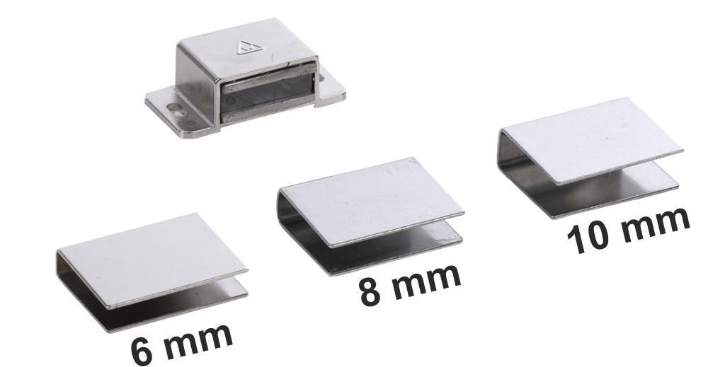 Magnet mit Haftkraft ca. 80 N (ca. 8 kg) (andere Haftkräfte sind auf Anfrage lieferbar) im vernickelten Metallgehäuse zum Anschrauben mit Langlochbefestigung zur einfachen Einstellung der Haftkraft. Maße Magnet: BxTxH ca. 46x24x15 mm; inkl. vernickeltem U-Haftblech (einfache Montage - U-Haftblech nur auf die Glastüre aufstecken), Maße U-Haftblech: HxB ca. 35x27 mm